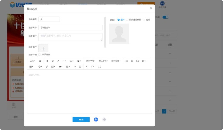 在【选手管理】中,上传所有选手的信息,包括选手的名称、简介、照片或者视频等。