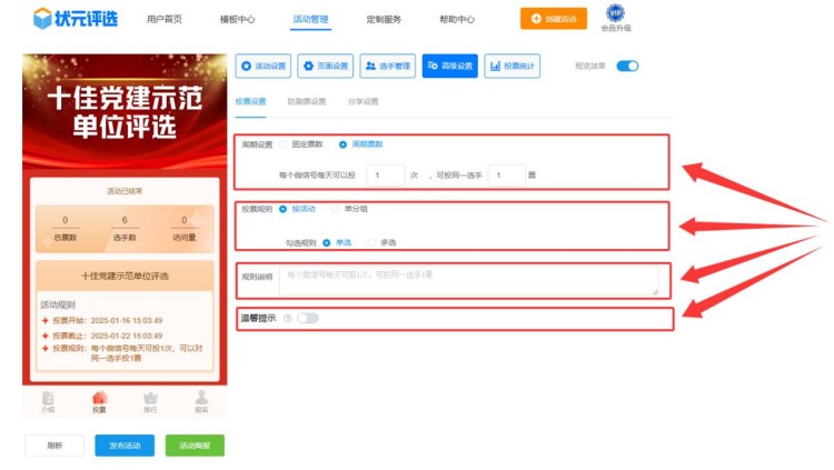 在【高级设置】中,设置投票规则,如活动期间可以给几名选手投票、又能够投几票等。