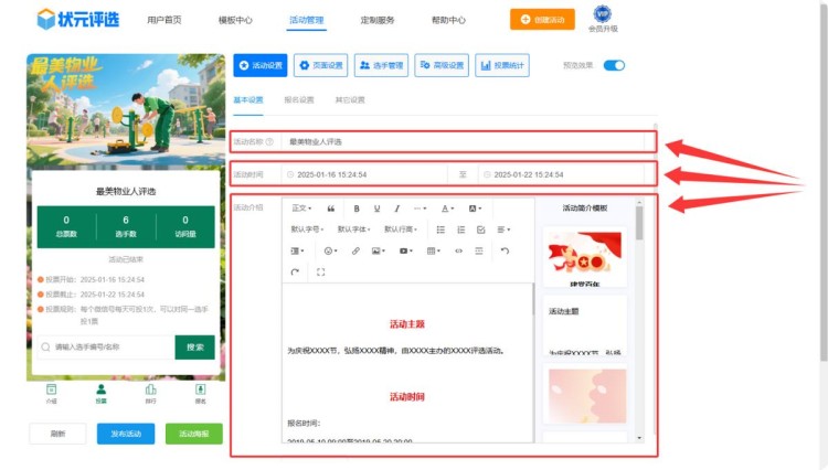 第三步,在【活动设置】中,修改活动名称、设置活动起止时间、编辑活动介绍。