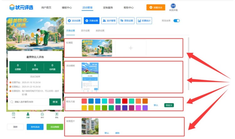 第四步,在【页面设置】中,上传主题轮播图,并根据轮播图的颜色,来调整配色方案、更换背景图片等。