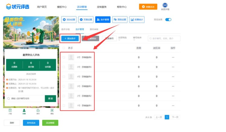 第五步,在【选手管理】中,上传所有选手的个人资料,包括选手的名称、简介、照片或者视频等。