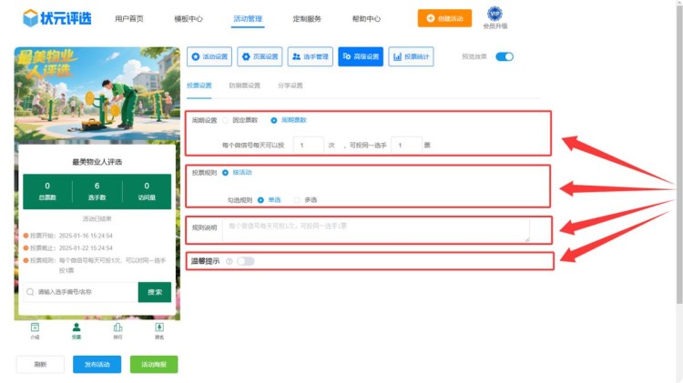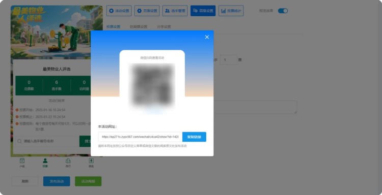 第七步,上述步骤完成后,点击【发布活动】,系统会自动生成投票链接和二维码。将其保存下来并分享出去,即可开启网络评选活动,选出最终的获胜者。