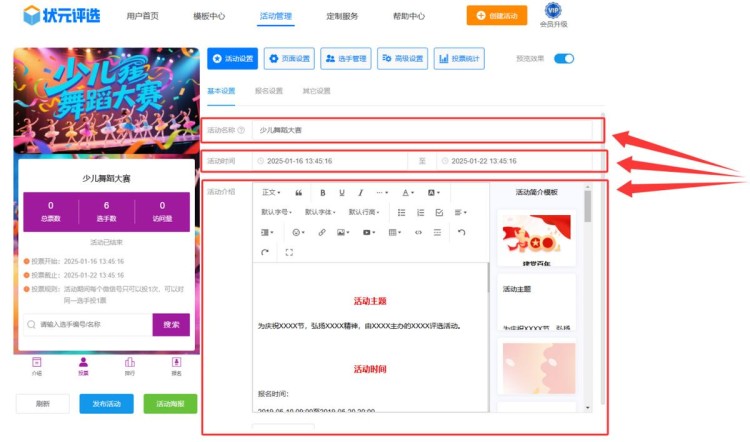 在【活动设置】中,将活动名称改为少儿舞蹈大赛,并设置活动起止时间、编辑活动介绍。