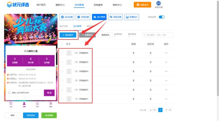 在【选手管理】中,上传所有选手的个人资料,包括选手的名称、简介、照片或者视频等。
