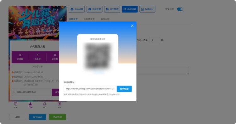 上面这些步骤都做完,且仔细检查确定没有问题之后,点击【发布活动】,系统会自动生成投票链接和二维码。这样少儿舞蹈大赛网络投票评选活动就制作完成了,您学会了吗?