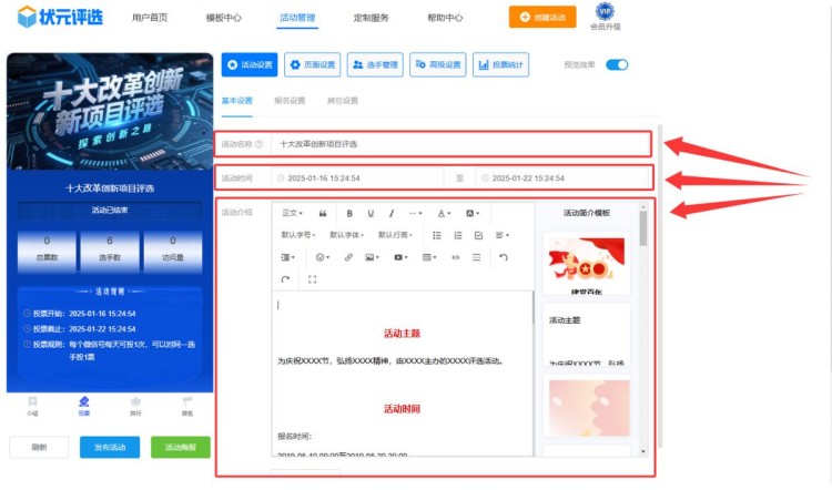 再者,在【活动设置】中,编辑活动信息,包括活动名称、时间、简介。