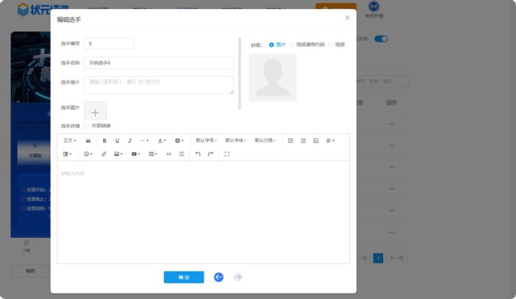 然后,在【选手管理】中,上传所有参与此次评选活动的选手资料,包括选手的名称、简介、照片或者视频等。