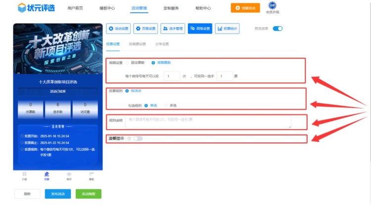 再然后,在【高级设置】中,完成投票规则,如活动期间,可以给几名选手投票、又可以投几票等。