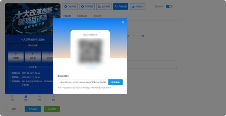 最后,点击【发布活动】,系统会自动生成投票链接和二维码。这样一场网络投票活动就制作完成了,是不是很简单?