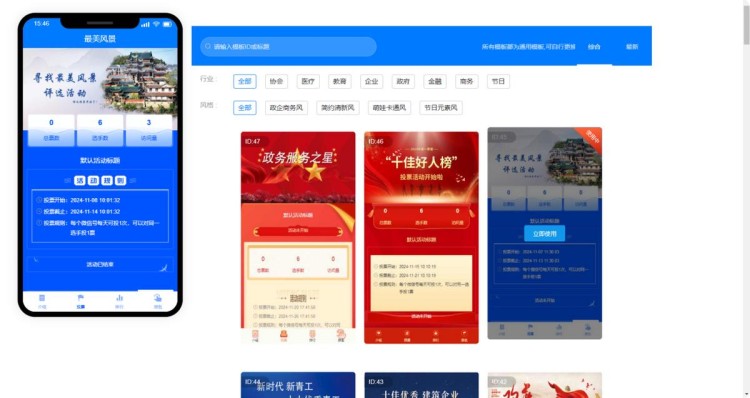 登录后,系统会自动跳转至活动后台。在【模板中心】,可选择与主题相契合的模板样式,选定后可以一键套用。
