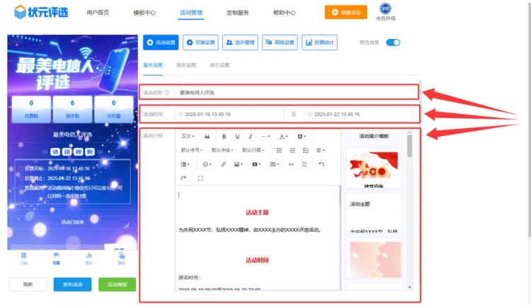 在【活动设置】中,将活动名称改为最美电信人评选,并设置活动开始和结束的时间,编辑活动介绍。
