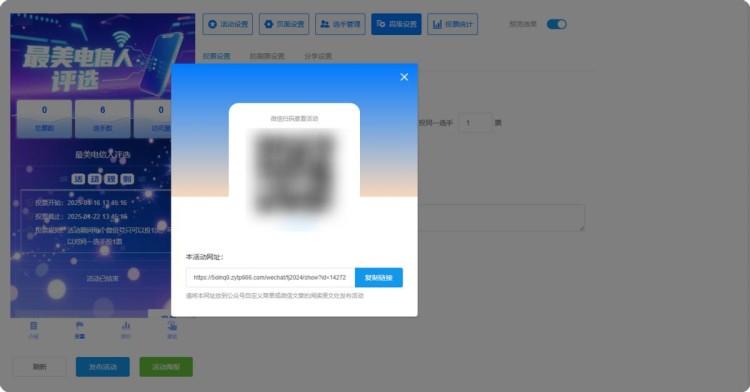 上面这几步都完成,且仔细检查确定没有问题后,点击【发布活动】,系统会自动生成投票链接和二维码。这样最美电信人网络投票评选活动就制作完成了,您学会了吗?