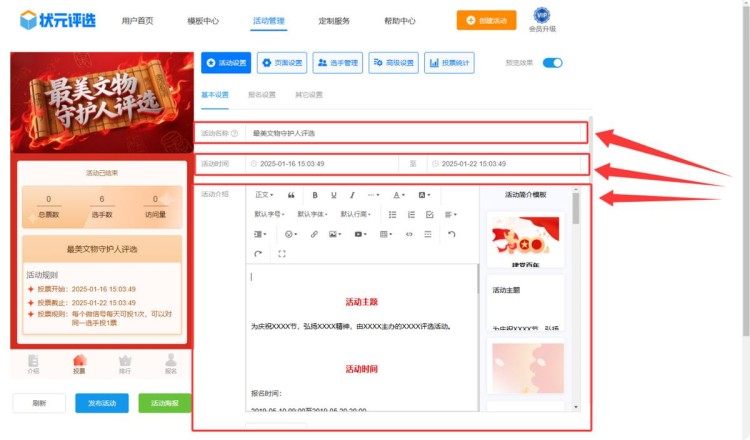 再者,在【活动设置】中,编辑活动信息,包括活动名称、时间、简介。