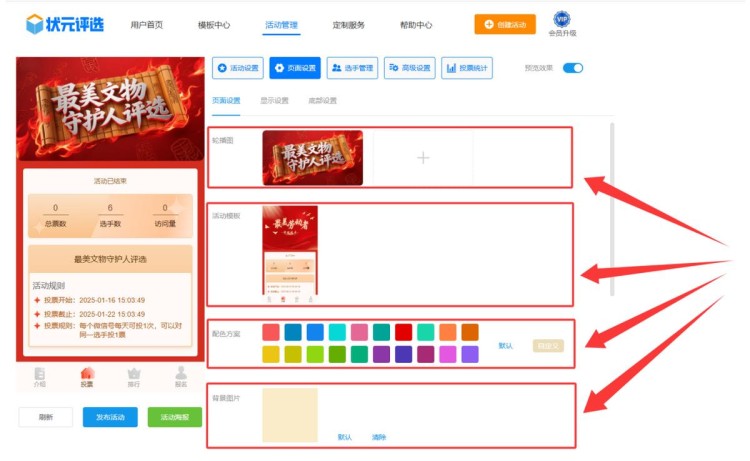 接下来,在【页面设置】中,上传主题轮播图,并根据活动需要,完成其他页面设置上的操作,如添加背景音乐、漂浮物等。