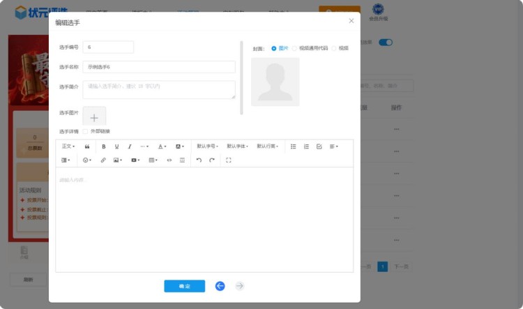 然后,在【选手管理】中,上传所有选手的个人资料,包括选手的名称、简介、照片或者视频等。