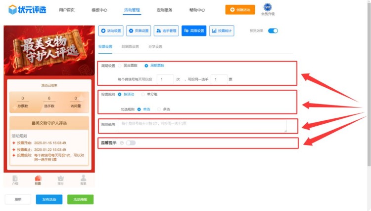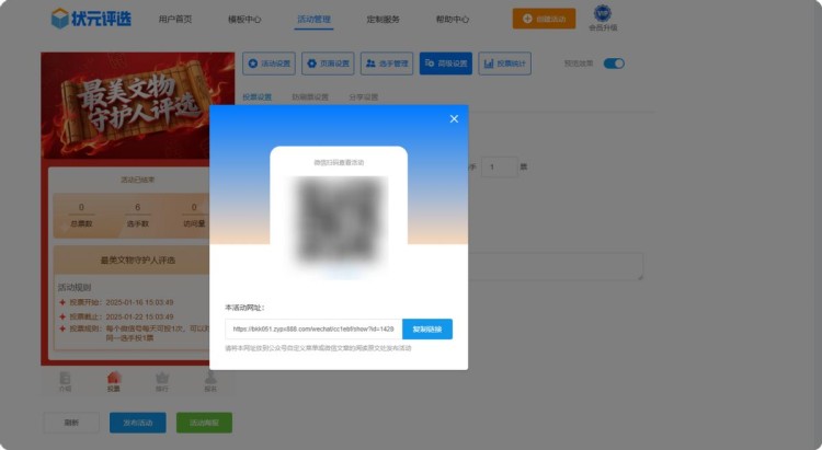 最后,点击【发布活动】,系统会自动生成投票链接和二维码。将其保存下来并分享出去,即可开启网络评选活动,选出最终的获胜者。