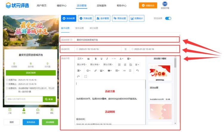 第三步,在【活动设置】中,将活动名称改为年度最受欢迎旅游县城微信投票评选活动,并设置活动起止时间、编辑活动介绍。