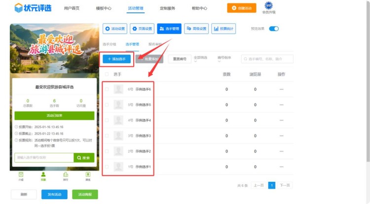 第五步,在【选手管理】中点击【添加选手】或者【示例选手】,上传所有选手的个人资料,包括选手的名称、简介、照片或者视频等。