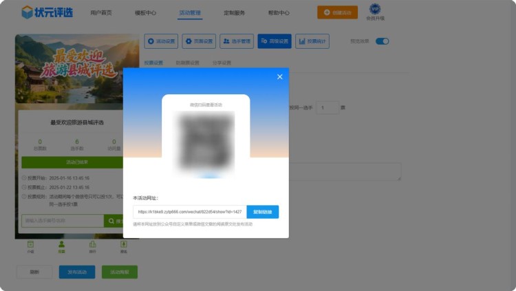 第七步,点击【发布活动】,系统会自动生成投票链接和二维码。这样最受欢迎旅游县城网络评选活动就制作完成了,您学会了吗?
