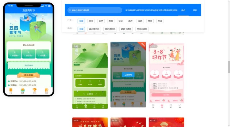 登录后,系统会自动跳转至活动后台。在【模板中心】,可以选择与主题相契合的模板样式,如知识产权十大事件、创业之星等。