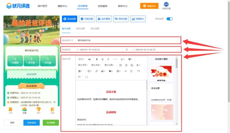 在【活动设置】中,修改活动名称、设置活动时间、编辑活动介绍。