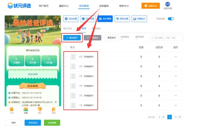 在【选手管理】中点击【添加选手】或者【示例选手】,上传所有选手的个人资料,包括选手的名称、简介、照片或者视频等。