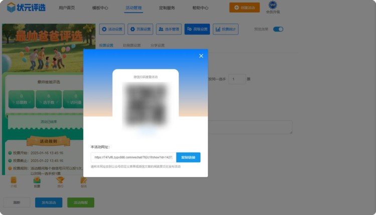 上述步骤完成,且仔细检查确定没有问题后,点击【发布活动】,系统会自动生成投票链接和二维码。这样一场与父亲节相关的微信评选活动就制作完成了,是不是很简单?