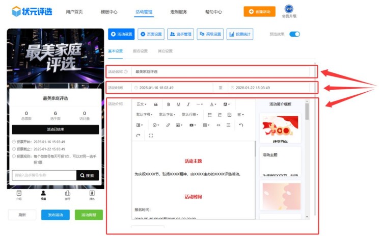 第三步,在【活动设置】中,修改活动名称、设置活动起止时间、编辑活动介绍。