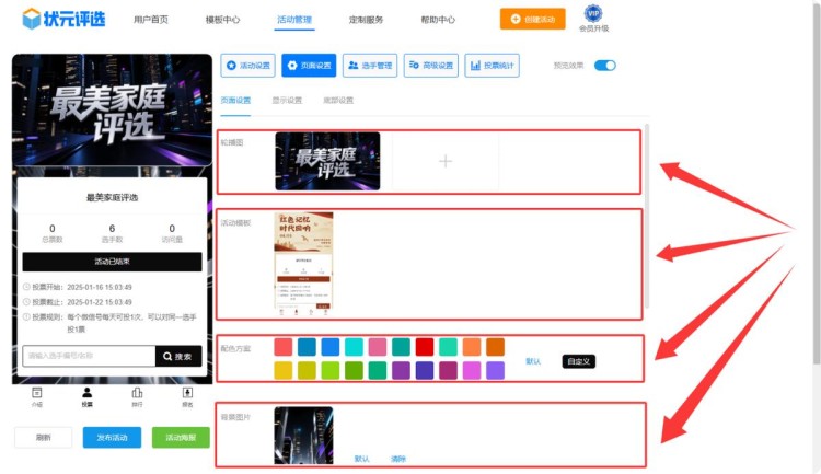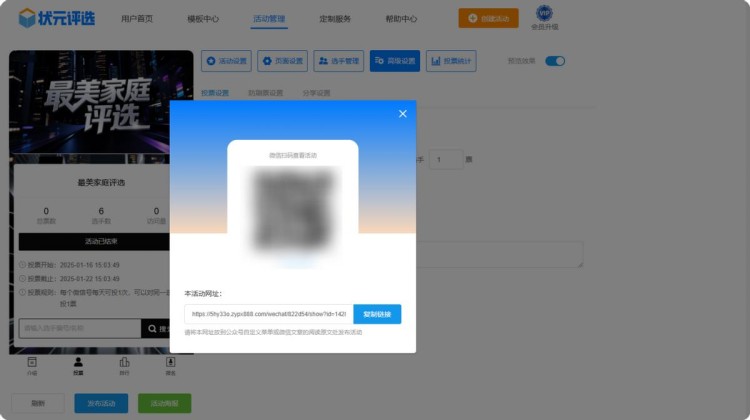 第七步,上述步骤完成,且仔细检查确定无误后,点击【发布活动】,系统会自动生成投票链接和二维码。将其保存下来并分享出去,即可开启网络评选活动,选出最终的获胜者。