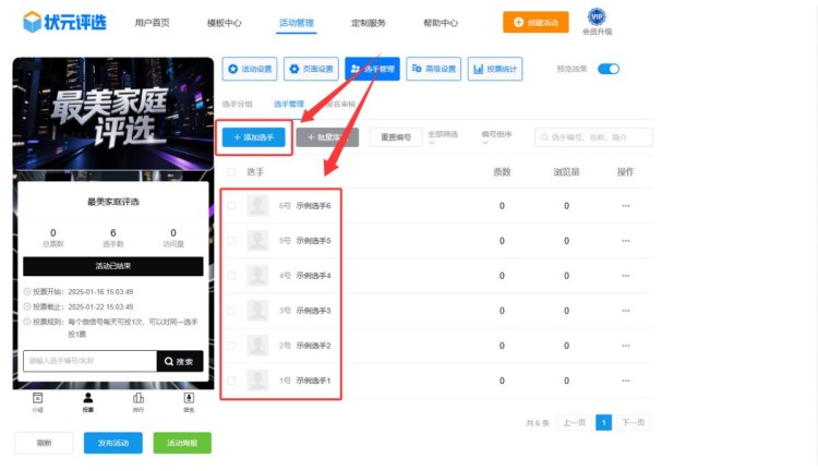 第五步,在【选手管理】中,上传所有选手的个人资料,包括选手的名称、简介、照片或者视频等。