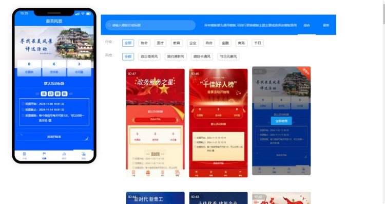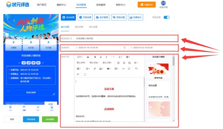 其次,登录后,系统会自动跳转至活动后台。在【模板中心】,选择与主题相契合的模板,如知识产权十大事件、创业之星等。