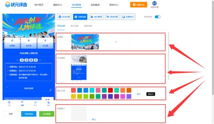 制作网络评选活动选活动,一定要选择专业的投票制作平台,比如状元评选。它具备强大的技术支撑,能有效保障数据安全与活动公平,通过 IP 限制、行为监测等手段防范刷票、恶意攻击等作弊行为,避免人工刷票导致的结果失真。同时,功能更为丰富多元,支持自定义投票页面风格、设置投票规则(如每日投票次数、投票范围等),还能实时生成数据报表,让票数统计、用户参与情况等信息一目了然,便于活动主办方管理。