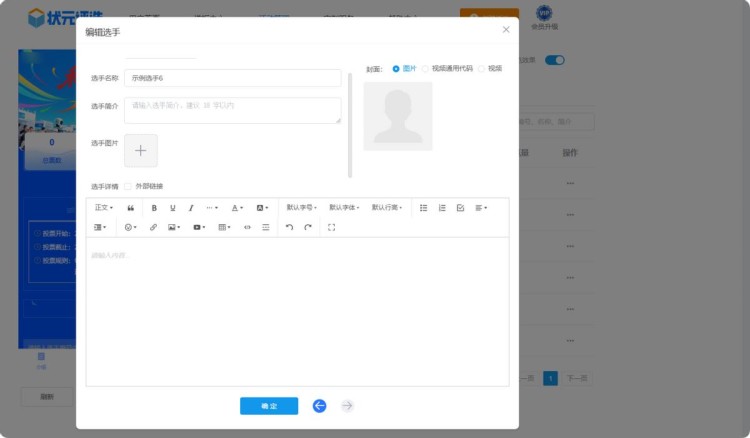 然后,在【选手管理】中,上传所有选手的个人资料,包括选手的名称、简介、照片或者视频等。