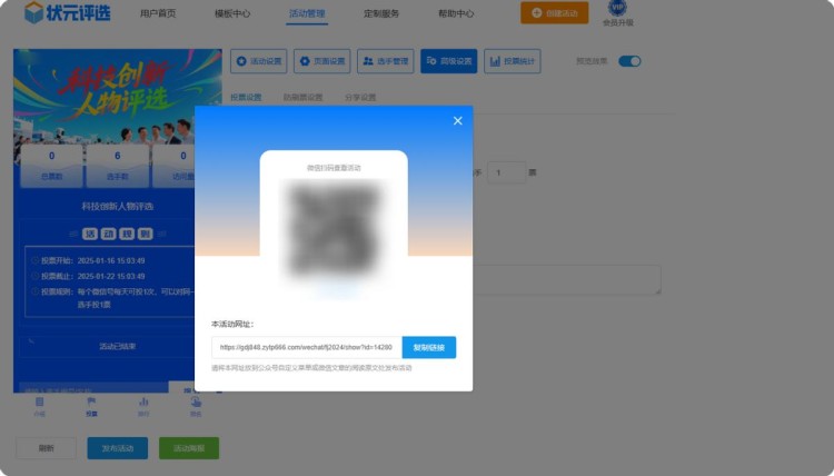 最后,点击【发布活动】,系统会自动生成投票链接和二维码。将其保存下来并分享出去,即可开启网络评选活动,选出最终的获胜者。