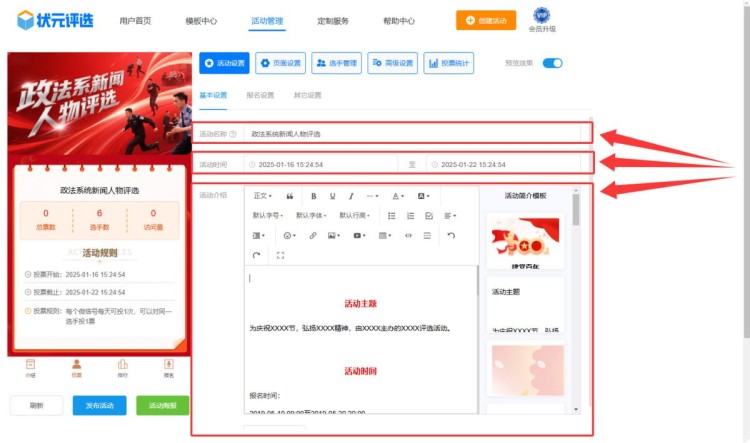 第三步,在【活动设置】中,将活动名称改为政法系统新闻人物评选,并设置活动起止时间、编辑活动介绍。