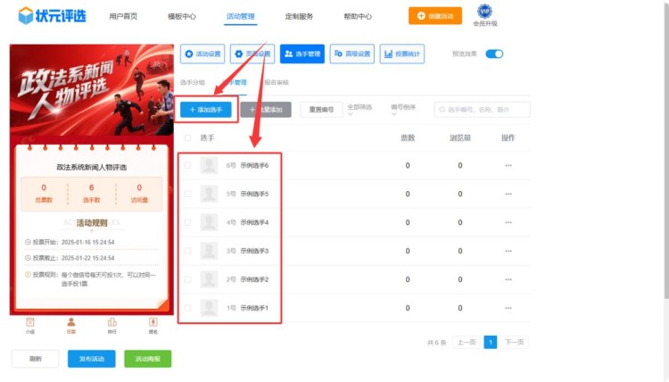第五步,在【选手管理】中,上传所有选手的个人资料,包括选手的名称、简介、照片或者视频等。