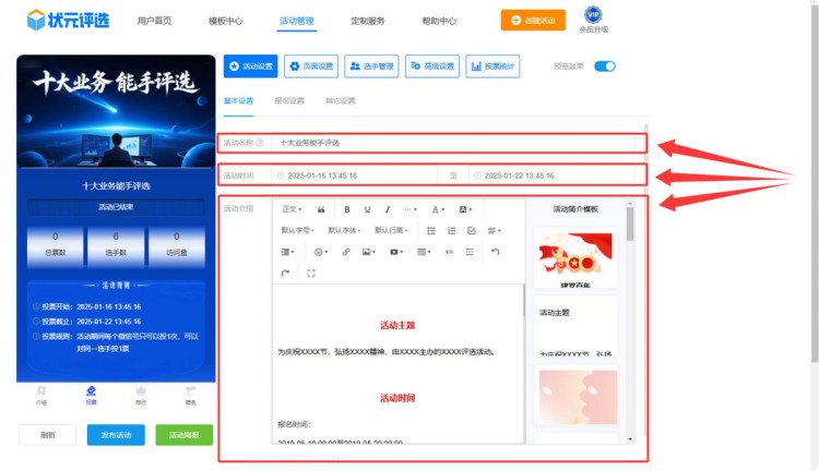 第三步,在【活动设置】中,将活动名称改为十大业务能手评选,并设置活动起止时间、编辑活动介绍。
