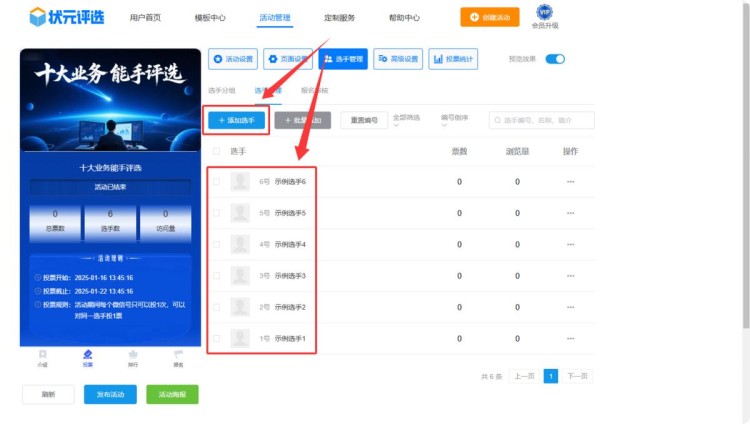 第五步,在【选手管理】中,上传所有选手个人资料,包括选手的名称、简介、照片或者视频等。