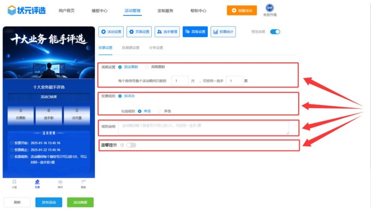 第六步,在【高级设置】中,设置投票规则。如活动期间,可以给几名选手投票、又能投几票等。