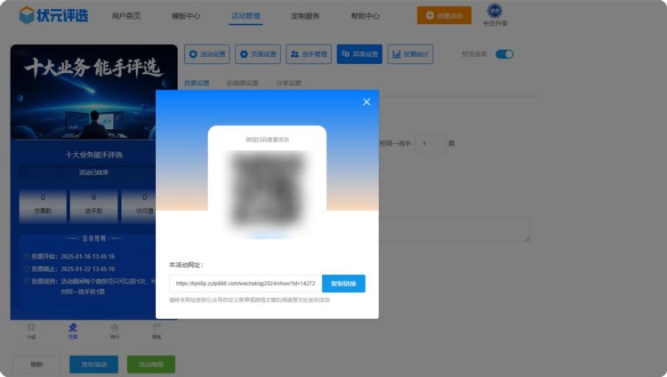 第七步,上述步骤完成,且仔细检查确定没有问题后,点击【发布活动】,系统会自动生成投票链接和二维码。这样十大业务能手网络评选活动就制作完成了,您学会了吗?