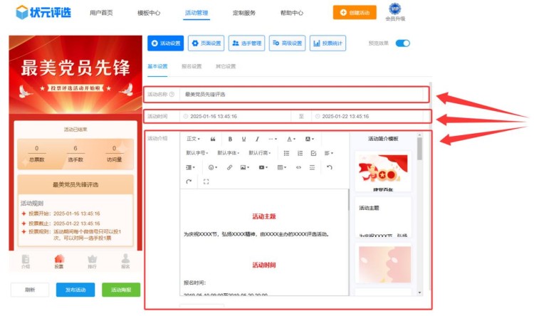 第三步,在【活动设置】中,将活动名称改为最美党员先锋评选,并设置活动起止时间,编辑活动介绍。
