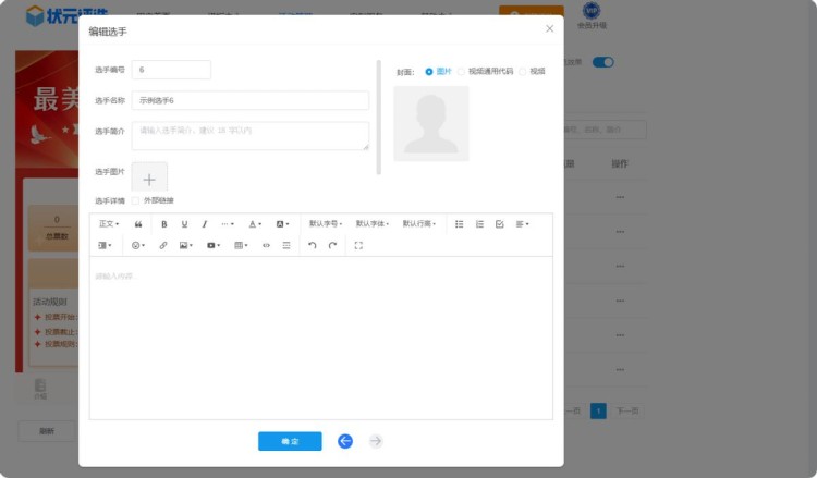 第五步,在【选手管理】中,上传所有选手的个人资料,包括选手的名称、简介、照片或者视频等。