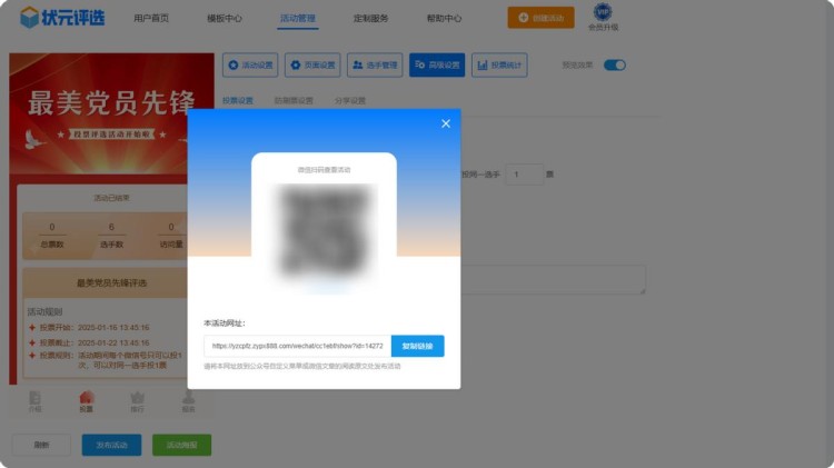 第七步,点击【发布活动】,系统会自动生成投票链接和二维码。这样最美党员先锋网络评选活动就制作完成了,是不是很简单?