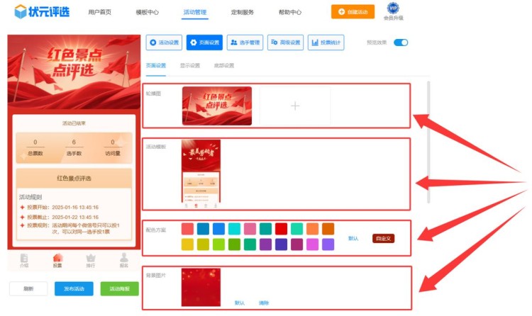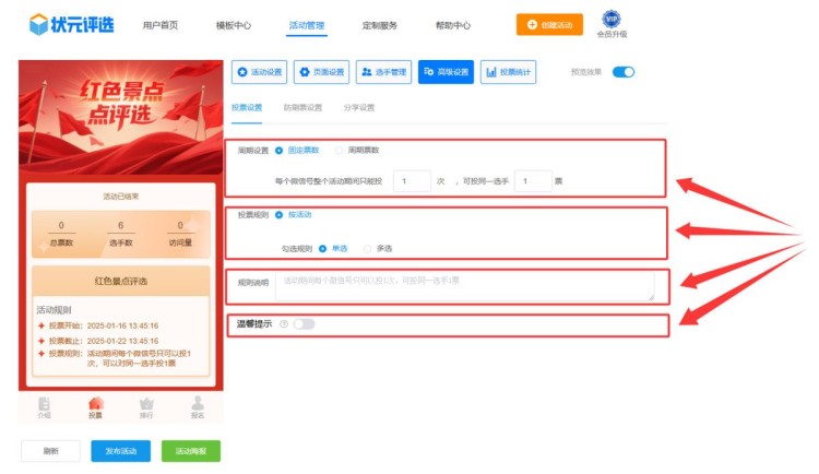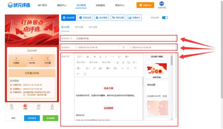 第三步,在【活动设置】中,将活动名称改为红色景点评选,并设置活动起止时间、编辑活动介绍。
