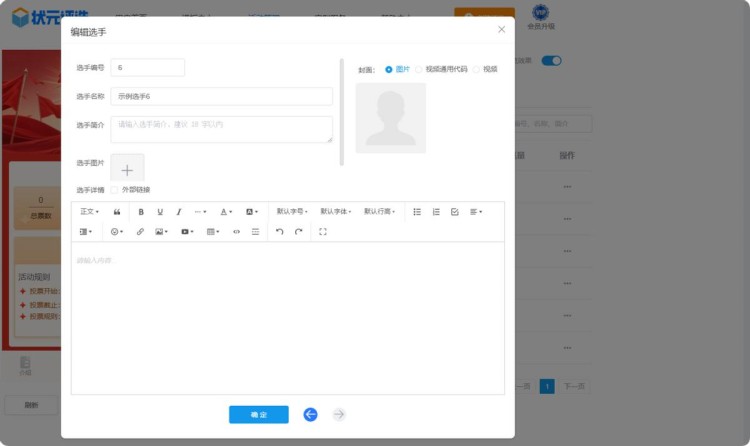 第五步,在【选手管理】中,上传所有选手的个人资料,包括选手的名称、简介、照片或者视频等。