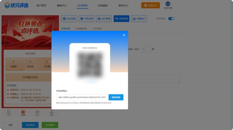第七步,上述步骤完成,且仔细检查确定无误后,点击【发布活动】,系统会自动生成投票链接和二维码。通过以上步骤即可创建红色景点微信评选活动,您学会了吗?