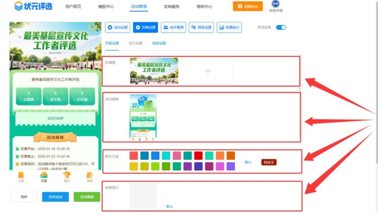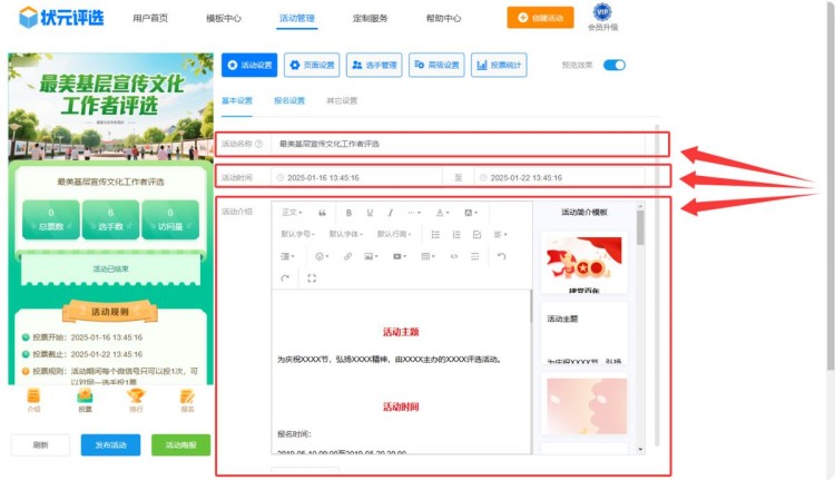 第三步,在【活动设置】中,将活动名称改为最美基层宣传文化工作者评选,并设置活动起止时间、编辑活动介绍。
