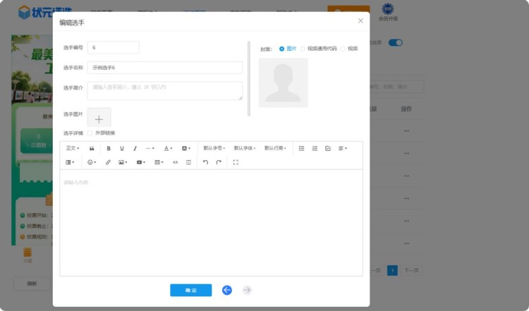 第五步,在【选手管理】中,上传所有选手的个人资料,包括选手的名称、简介、照片或者视频等。