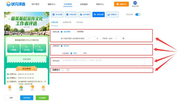 第六步,在【高级设置】中,设置投票规则,如活动期间,可以给几名选手投票,又能投几票等。