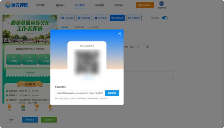 第七步,点击【发布活动】,系统会自动生成投票链接和二维码。这样最美基层宣传文化工作者微信评选活动就制作完成了,您学会了吗?